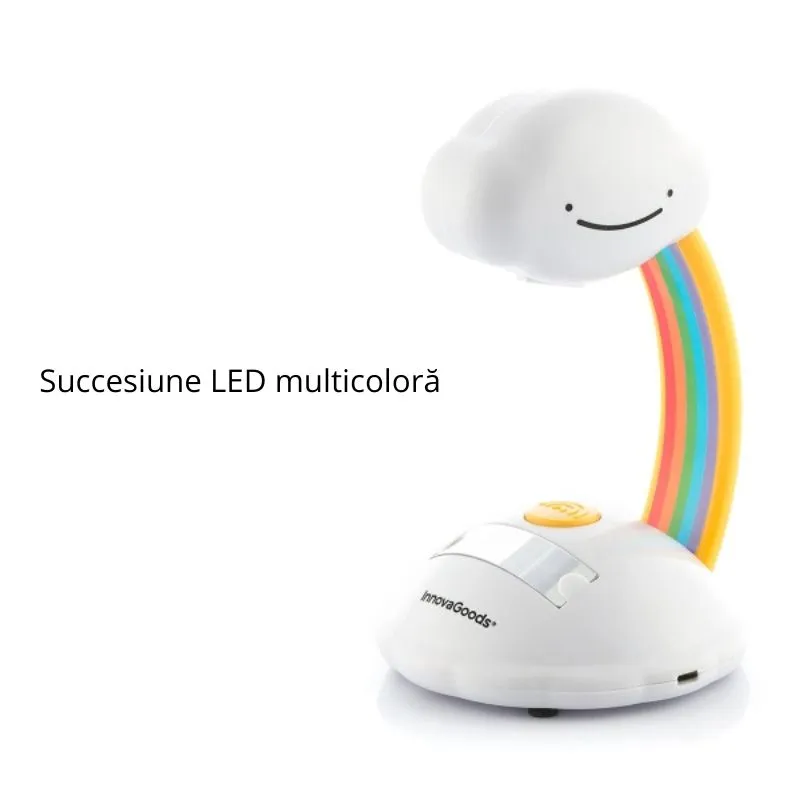Acest proiector este o lampa de veghe simpatica care te pazeste de toate spiritele rele, fara nicio exceptie. Detine in alcatuire un sistem LED care ilumineaza incaperea intr-un mod clasic. Insa, pe langa sistemul traditional de illuminare, acest proiector detine capacitatea de a proiecta raze luminoase in nuantele curcubeului, care vor complementa design-ul simpatic in forma de nor.