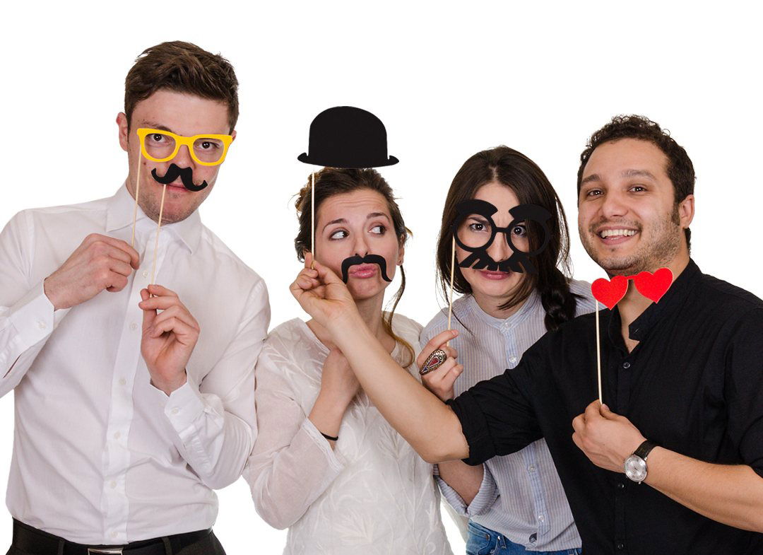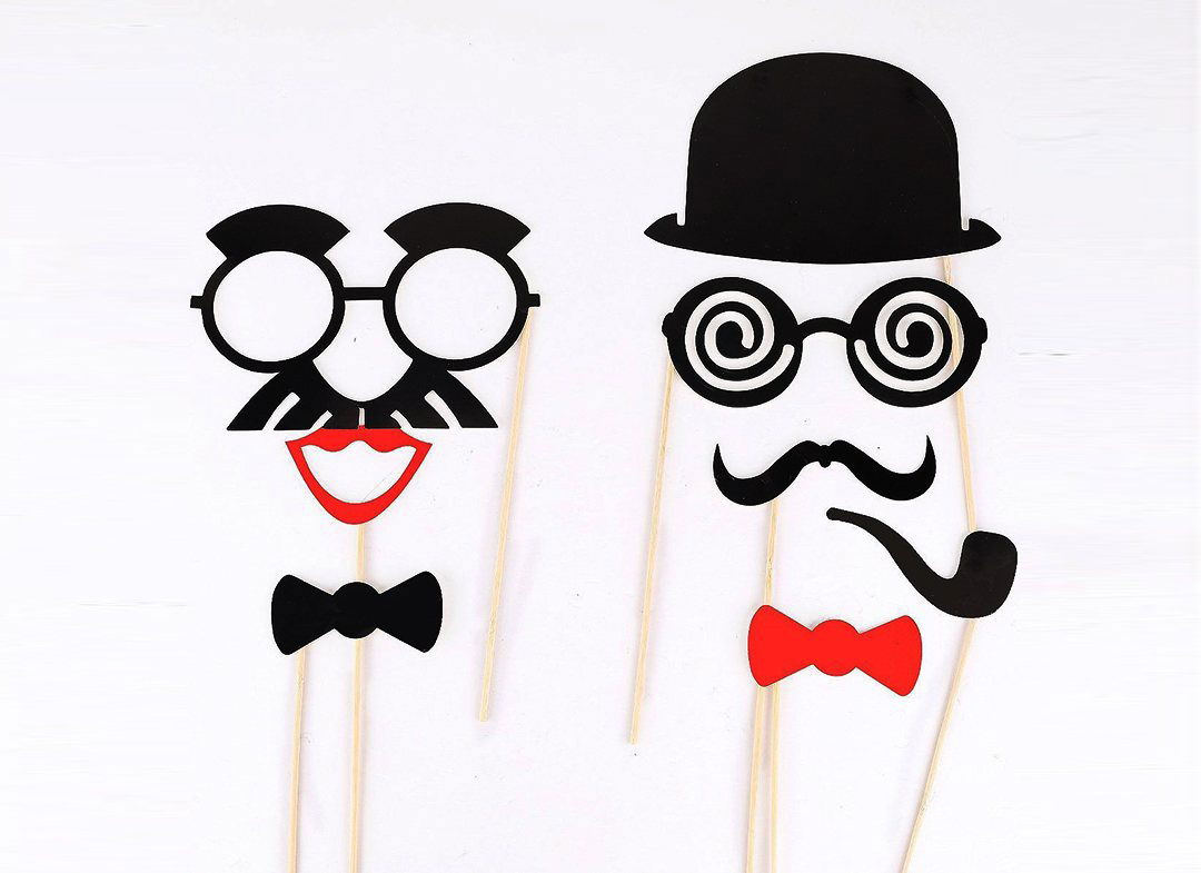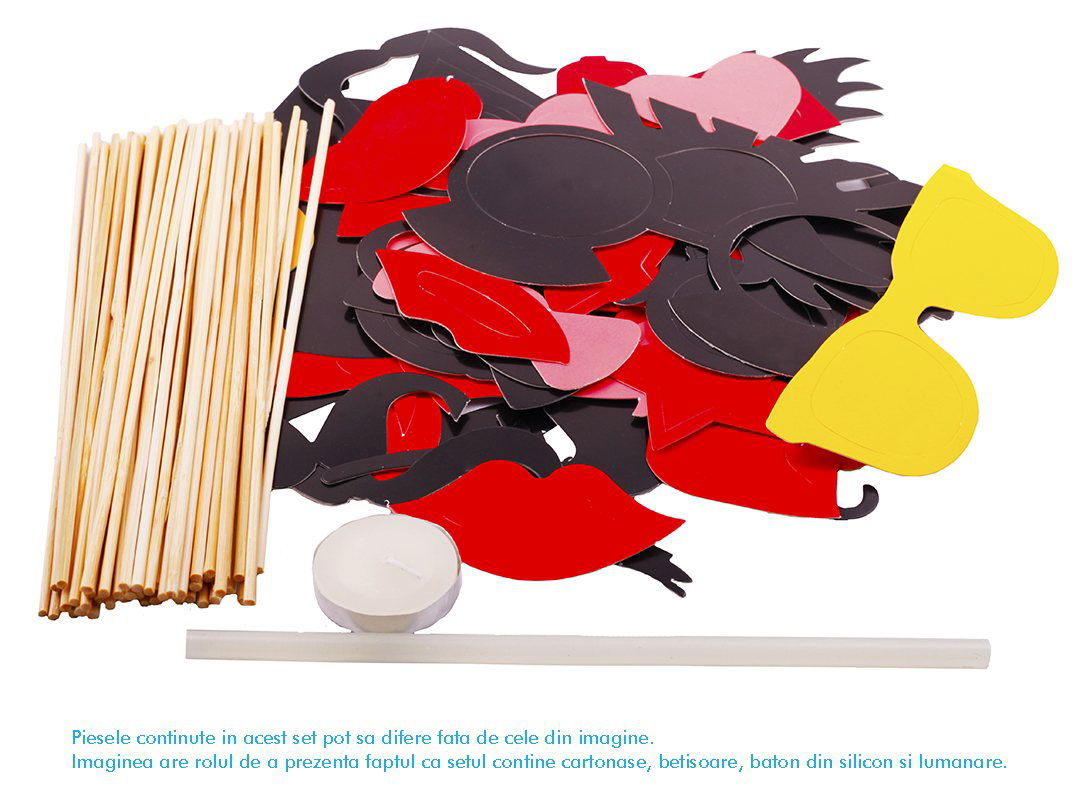 Setul de propsuri pentru fotografii contine piese pentru a realiza nelipsitele buze, mustati, o palarie clasica, scoasa din filmele cu Charlie Chaplin, o pipa, pentru a desavarsi arta de a fuma, ochelari pe bat, papioane colorate, pentru stil si eleganta – in total 49 de piese, astfel:
