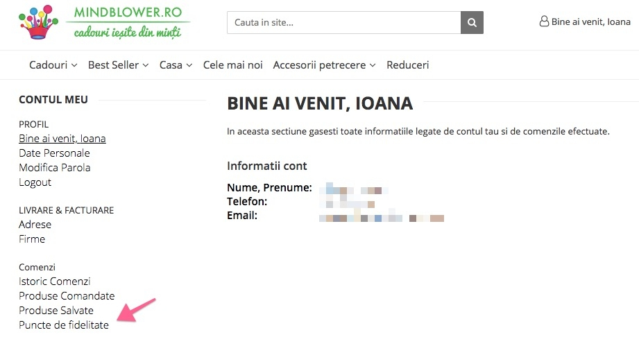 Puteti vedea oricand atat numarul total de puncte disponibile, cat si numarul de puncte obtinute la fiecare comanda efectuata. Punctele de fidelitate pot fi accesate in Contul Meu - Comenzi - Puncte de Fidelitate.