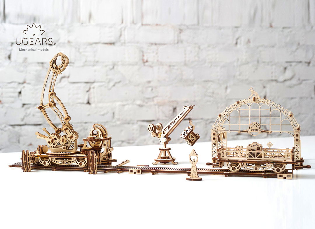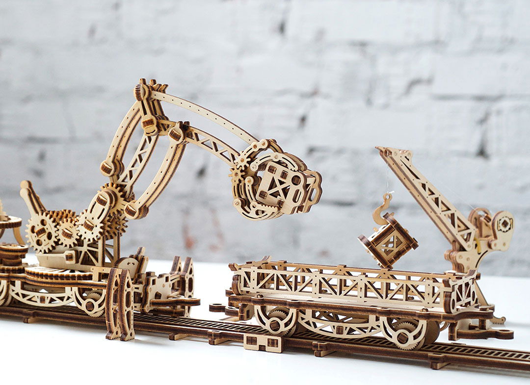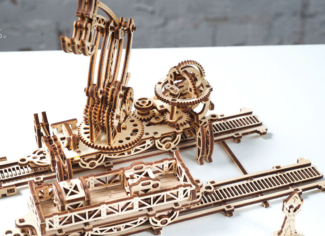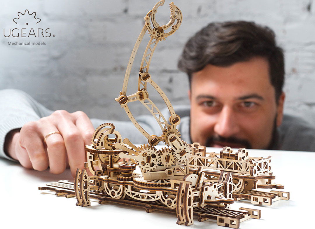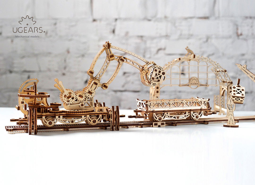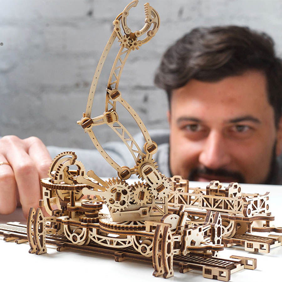Puzzle 3D Macara pe Sine din Lemn Ugears face parte din seria Orasul Mecanic. Setul contine un manipulator de marfa, 2 tipuri de sine, o schela de constructie, o macara si o remorca, 2 cutii de transport, 2 ancore de cuplare si 5 personaje:operatorul manipulatorului, muncitorul cu semnul de constructie, muncitorul cu lopata, muncitorul cu cheia, muncitorul cu ciocanul. Macaraua poate fi asamblata printr-o singura miscare a mainii, iar unghiul si rotirea sa poata fi blocate cu ajutorul unui maner.