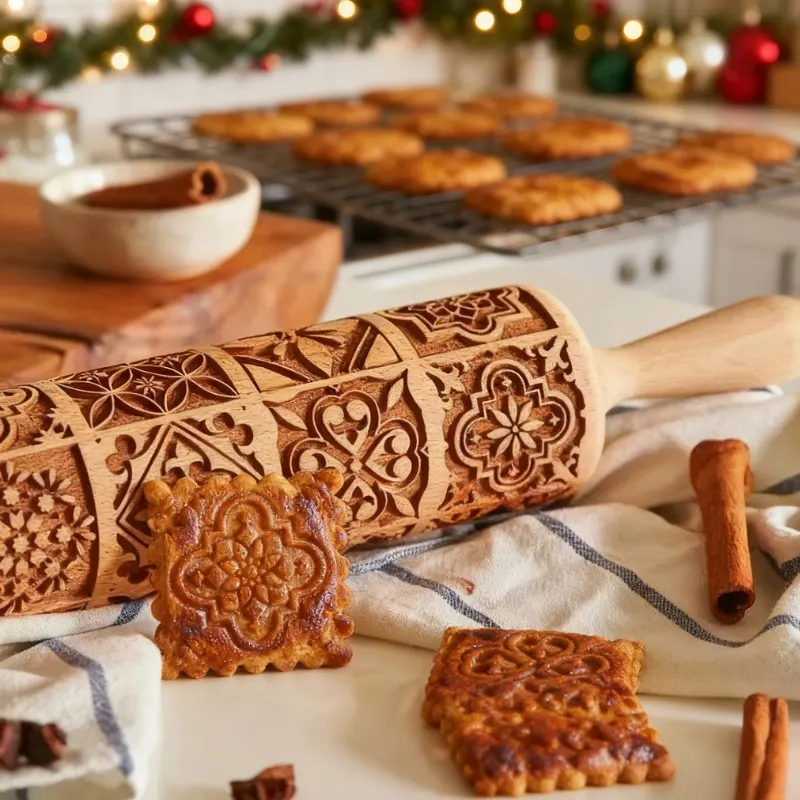 Sucitor creativ Sarbatori fericite este realizat din lemn de inalta calitate si prezinta gravuri laser cu modele intricate, ideale pentru a imprima pe aluat diverse forme festive. Design-ul este atent detaliat, oferind nu doar functionalitate, ci si un aspect decorativ. Cu o lungime de 35 cm si un diametru de 5 cm, acest sucitor este ergonomic si usor de manevrat, facandu-l potrivit pentru utilizarea regulata in bucatarie.