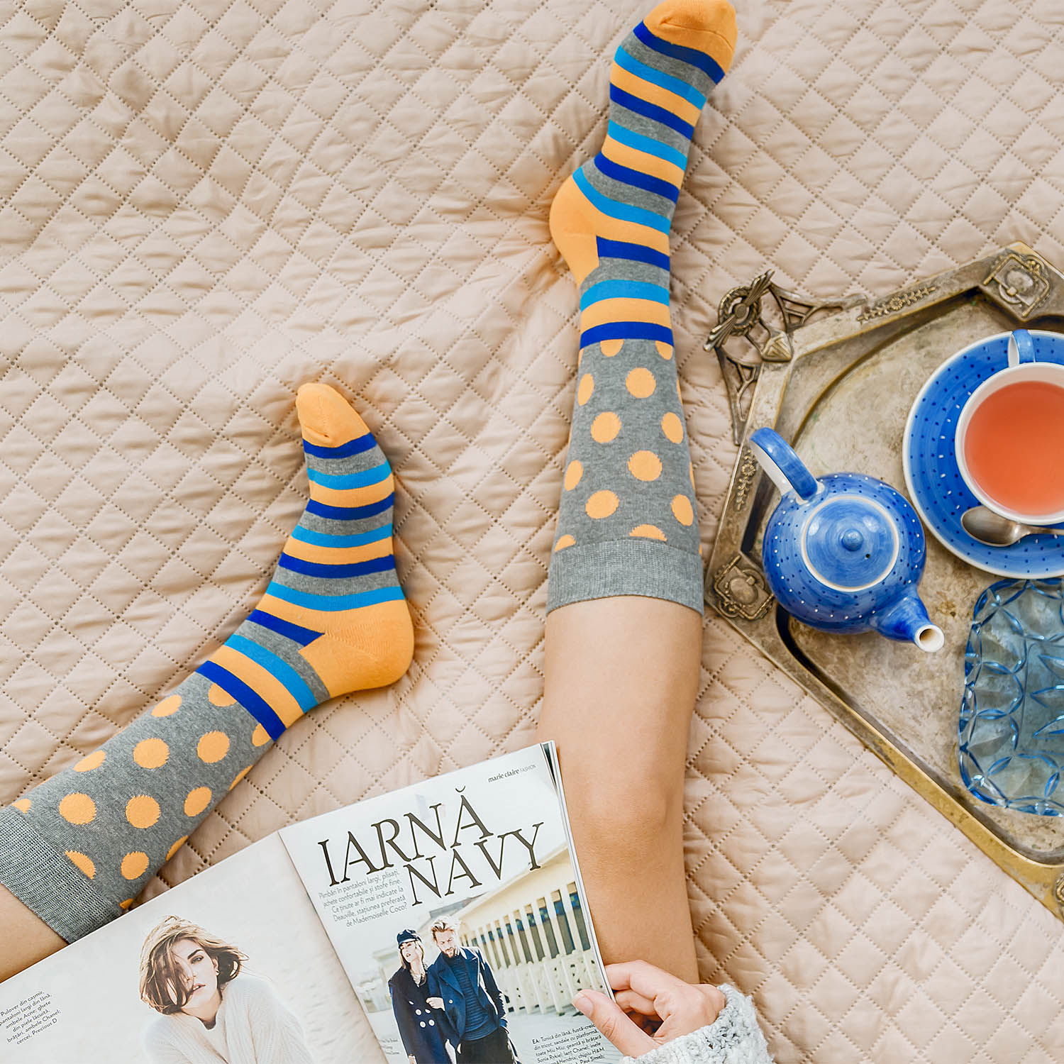 Utilizare: De ce sa te opresti la a purta cate o pereche de sosete colorate in fiecare zi? Acest set set contine 4 perechi de sosete ce au acelasi imprimeu, insa in culori diferite. Ia-ti inima in dinti si combina-le! Suntem siguri ca rezultatul va fi unul remarcabil.Cu un set 4 perechi sosete dungi si buline ai nenumarate optiuni de a fi creativ! Vezi aici intreaga colectie de sosete!