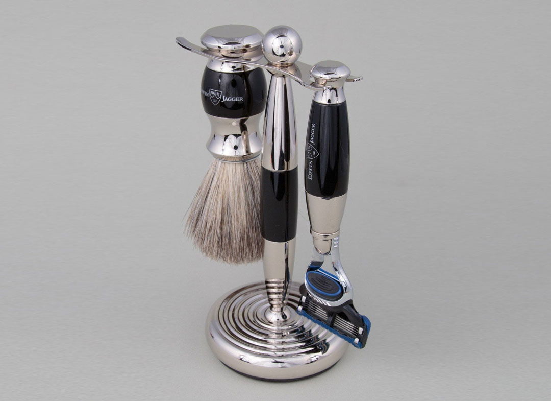 Set cadou barbati pentru barbierit 3 piese Light Horn Fusion Proglide, Edwin Jagger este un superb set de barbierit, realizat manual de maestrii artizani ai Edwin Jagger in Sheffield, Marea Britanie. Cadoul perfect pe care orice barbat il va iubi. Setul contine: - Pamatuf din par natural de bursuc Pure Badger cu maner din metal cromat. - Aparat de barbierit cu maner din metal cromat si insertie din poliester culoarea abanosului, cu rezerva Gillette Fusion Proglide. - Suport pentru aparat si pamatuf, din metal cromat. Aparatul de ras este special conceput pentru a reda un echilibru perfect intre forma si functionalitate. Manerul traditional placat cu crom este realizat manual in Marea Britanie sub marca Edwin Jagger si ofera cea mai buna manevrabilitate. Datorita tehnologiei avansate cu 5 lame, aparatul ofera o alunecare fara efort, un barbierit mai rapid si o necesitate de repetare mult mai mica ceea ce inseamna mai putine iritatii chiar si pentru pielea sensibila. Pamatuful este realizat manual in Marea Britanie de maestrii artizani ai Edwin Jagger si este unul dintre cele mai rafinate accesorii pentru barbierit.