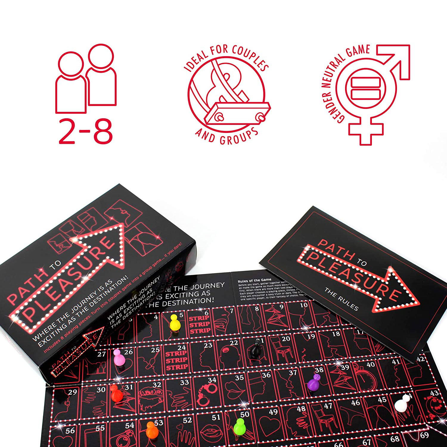 Inainte de a incepe seara romantica, pregateste si cateva accesorii care iti vor fi de mare folos, precum cuburi de gheata, un set de catuse din latex, ciocolata lichida, o bautura fina, ulei de masaj sau orice altceva iti mai trece prin cap. Cum se joaca The Path to Pleasure? Participantii arunca pe rand zarul fierbinte si cel care castiga incepe jocul. Fiecare jucator isi alege o piesa cu care se va deplasa pe tabla de joc, in functie de ce spune zarul, care trebuie aruncat inainte de fiecare deplasare. Apoi va citi indicatiile corespondente numarului patratului respectiv, fie ca e vorba despre o intrebare incitanta sau o provocare sexy, si va proceda in consecinta. In final, cine ajunge primul la patratul cu numarul 69 decide ce fantezie sexuala suprema vrea sa-i fie indeplinita. Sa inceapa calatoria!