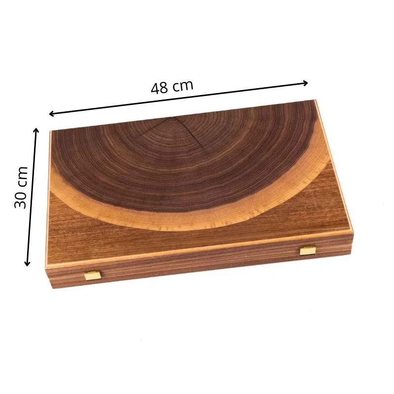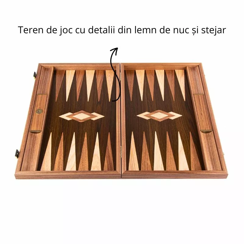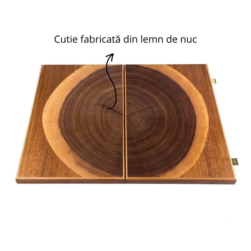1. Designul exclusivist: Tabla de joc a acestui backgammon are un aspect elegant si autentic, fiind fabricata din lemn de nuc cu o finisare naturala. Detaliile si textura lemnului confera jocului o nota rustica si distincta, aducand un sentiment de apropiere fata de natura. Fiecare piesa este atent finisata si gravata, reflectand maiestria si calitatea artizanatului.