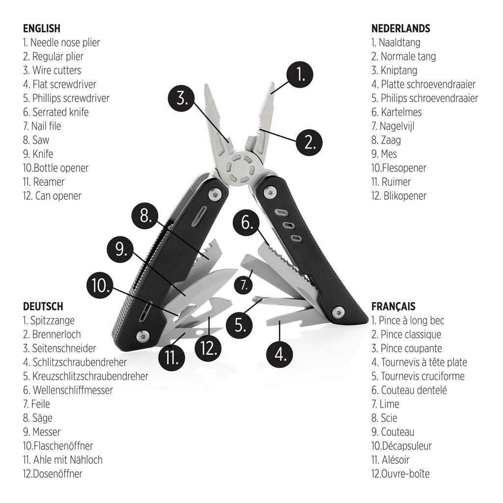 Barbatul bun la toate stie sa le faca pe toate chiar si in cele mai vitrege conditii. Fie ca-i femeia prea agitata, fie ca e in padure si are nevoie sa convinga un copac sa-i daruiasca niste crengi sau frunze, reuseste fara probleme sa le rezolve pe toate. Iar cu ajutorul la aceastei unealte multifunctionala de buzunar 12 in 1, Solid, un barbat bun la toate nu mai are nicio grija.