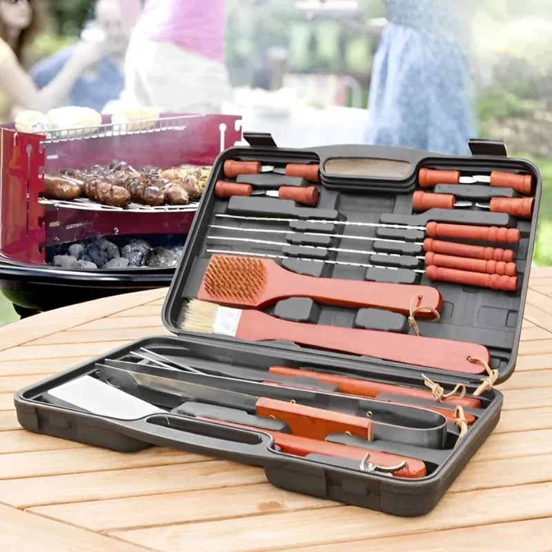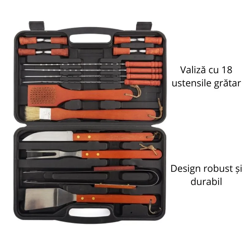 Set cadou valiza cu 18 ustensile gratar cuprinde un instrumentar profesional alcatuit din 18 piese, tot necesarul de care ai nevoie pentru o iesire in aer liber si/sau la camping, la picnic, care te vor ajuta sa ridici stafeta in timpul liber. Cu ajutorul lor vei pregati cele mai inedite preparate culinare, de la legume si fructe, pana la preparate din carne.